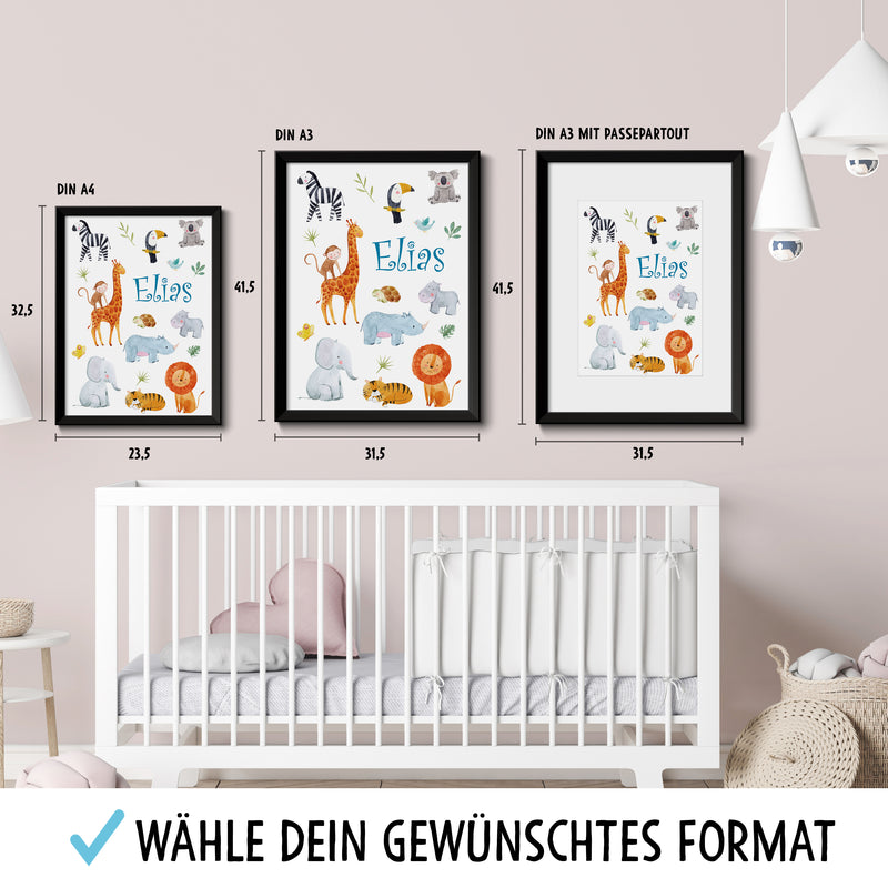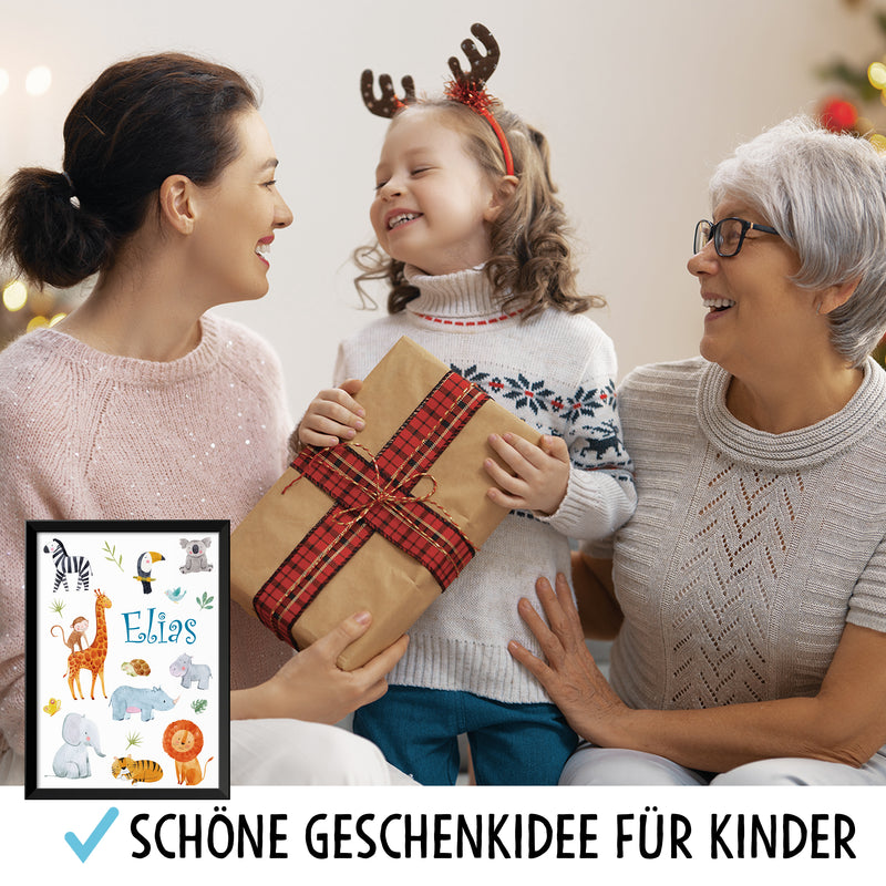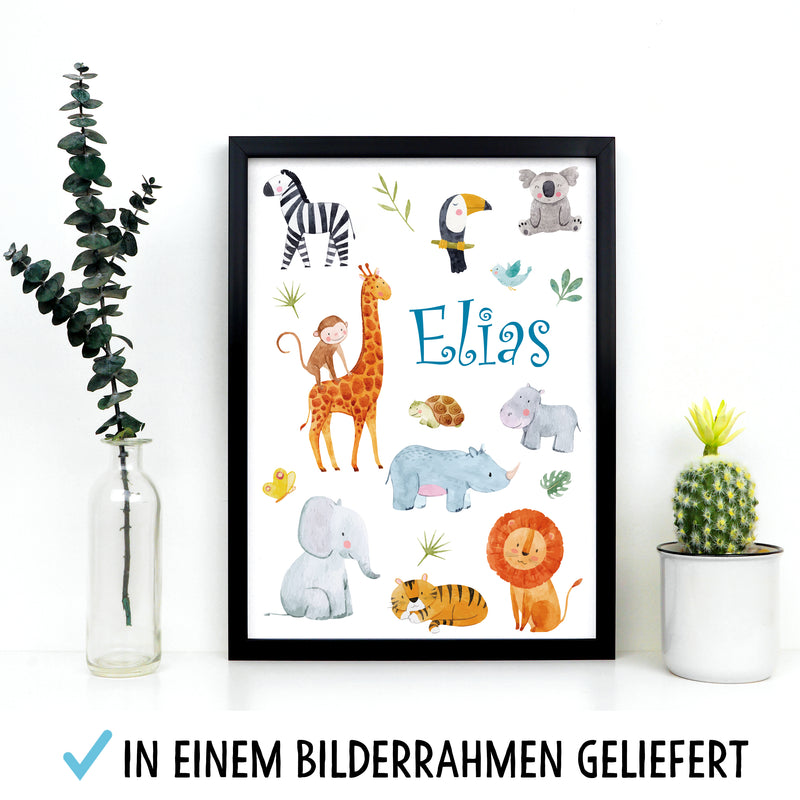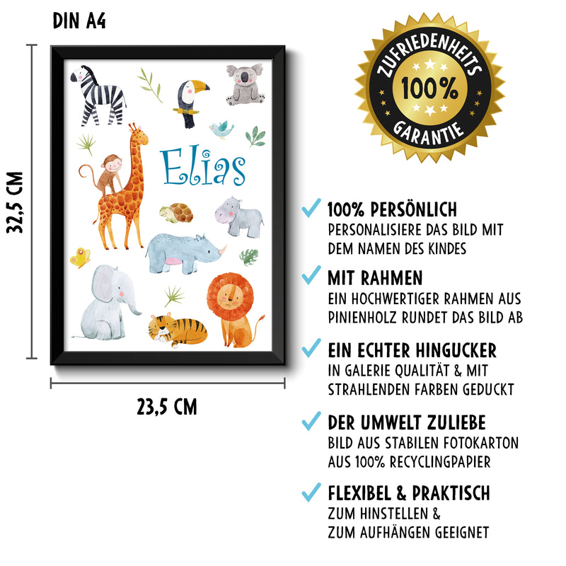Namensbild Safari Tiere Bild im Holz-Rahmen A4 Kinderbild Personalisiert mit Namen Geschenke Geschenkideen zur Geburt Baby Kind Mädchen Junge zur Taufe