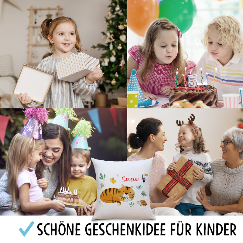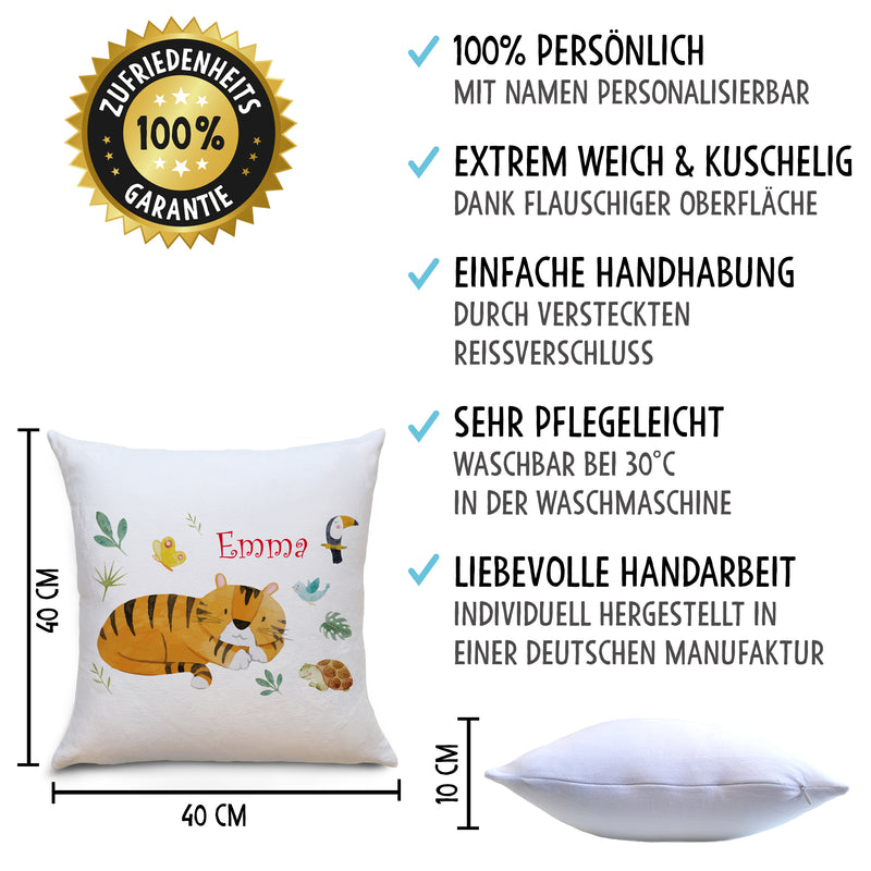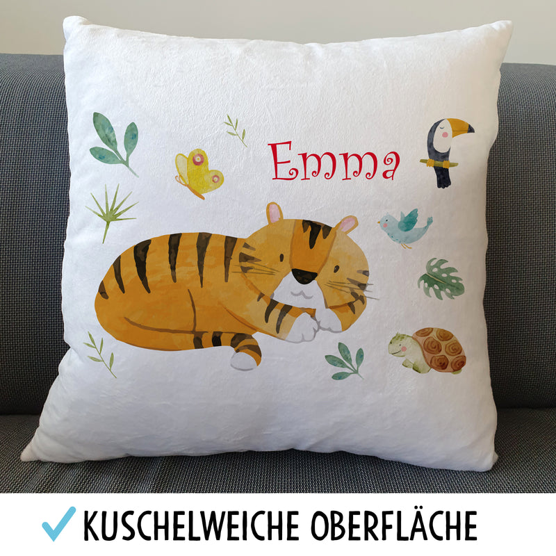 Tiger Safari Tiere Flauschiges Kissen mit Füllung Personalisiert mit Namen Geschenke Geschenkideen zur Geburt für Mädchen oder Junge als Glückwünsche Weihnachten