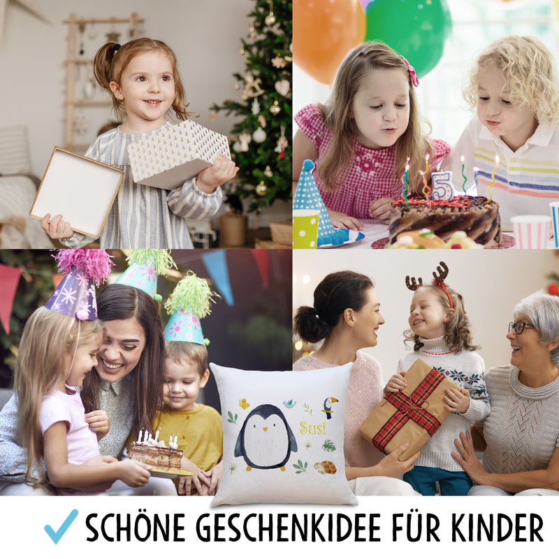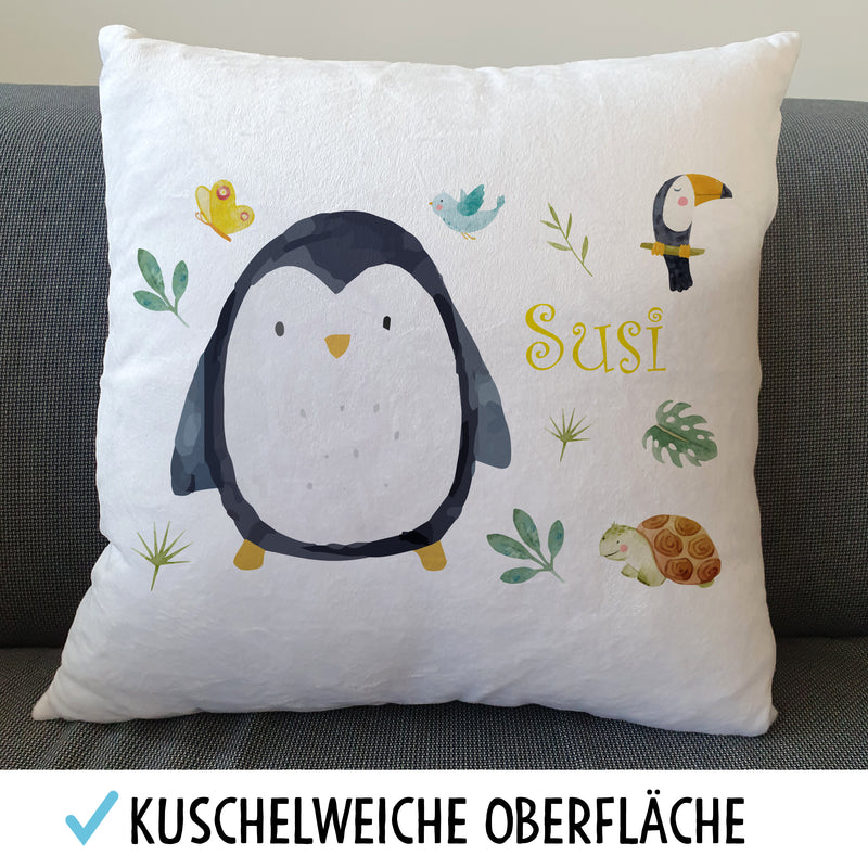 Pinguin Safari Tiere Flauschiges Kissen mit Füllung Personalisiert mit Namen Geschenke Geschenkideen zur Geburt für Mädchen oder Junge zum Geburtstag Weihnachten