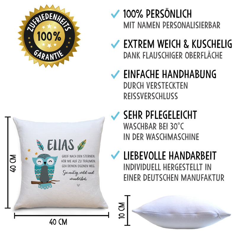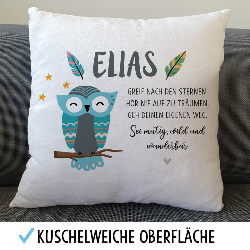 Kinderkissen Eule Boho Flauschiges Kissen mit Füllung Personalisiert mit Namen Geschenke Geschenkideen für Jungs Jungen zum Geburtstag Weihnachten