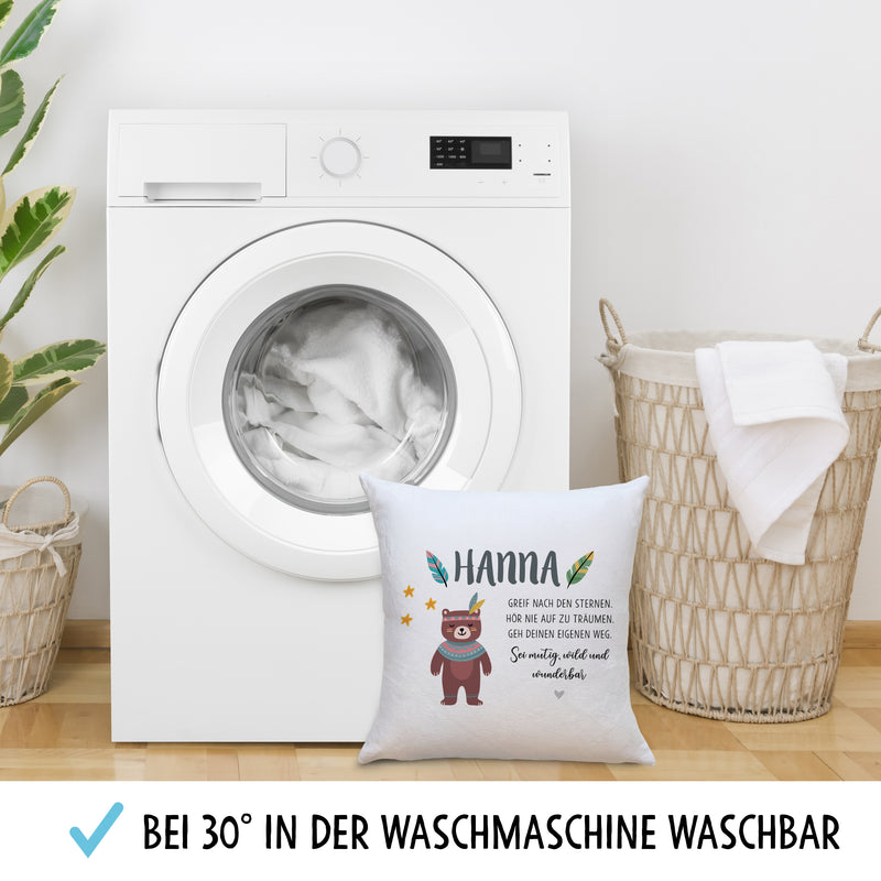 Das Kissen kann bei 30°C problemlos in der Waschmaschine gewaschen werden, ohne dass die leuchtenden Farben vom Motiv verblassen.