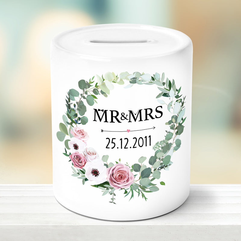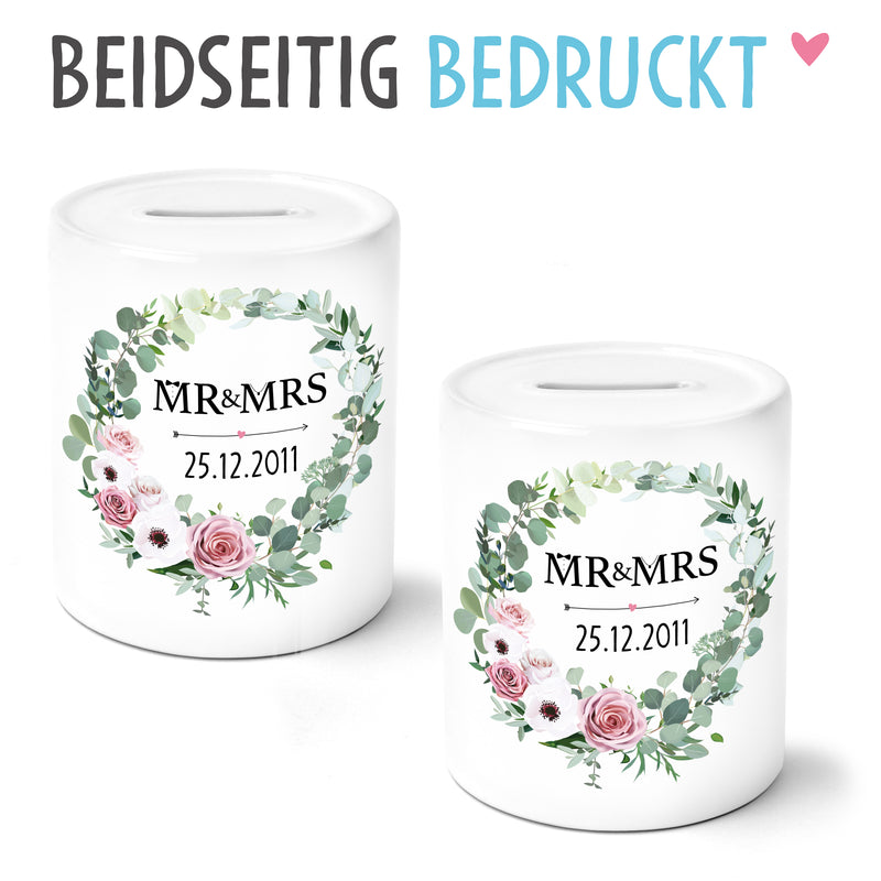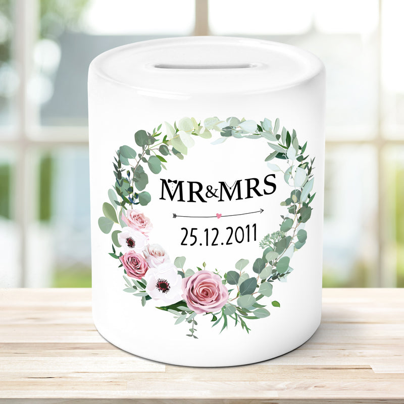 Mr & Mrs Blumenkranz mit Datum personalisiert Spardose Geldgeschenke Geschenkideen für das Brautpaar zur Hochzeit Geburtstag