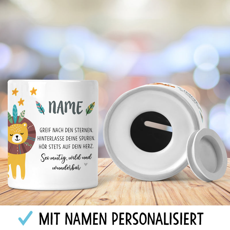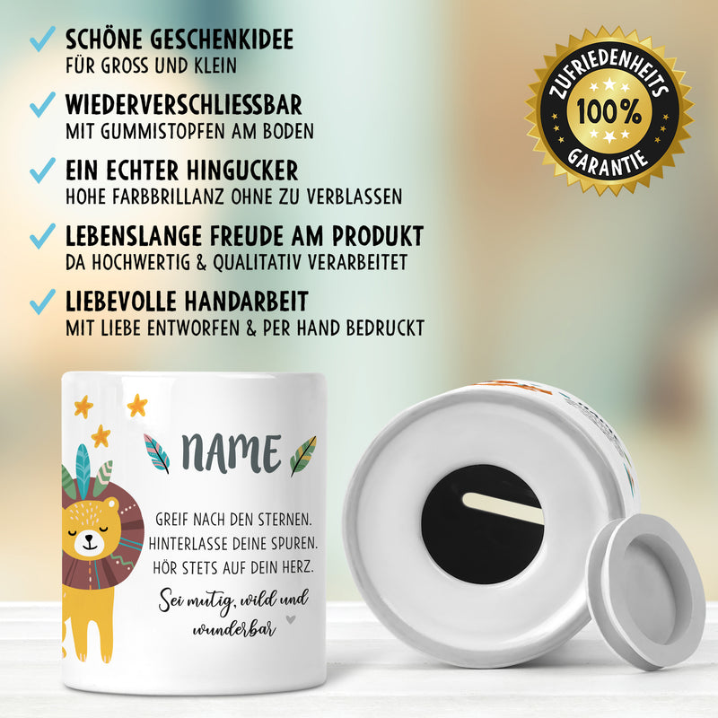 Boho Löwe Kinder Spardose Personalisiert mit Namen Geschenke Geschenkideen für Mädchen zum Geburtstag Weihnachten Einschulung Taufe Geburt Sparschwein