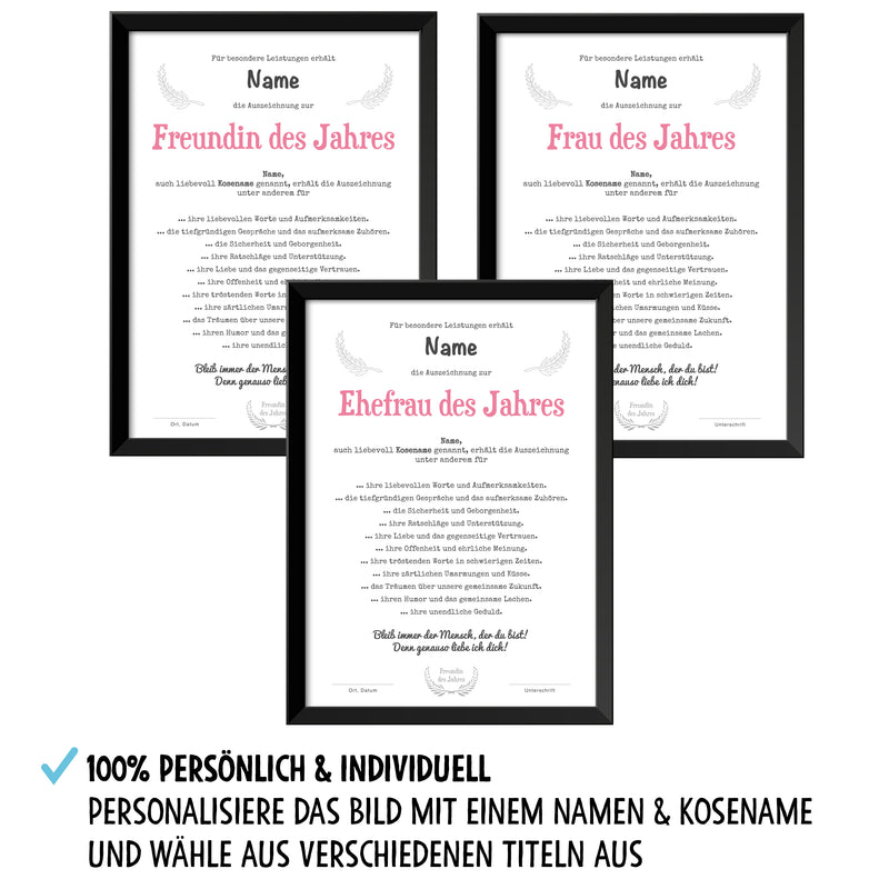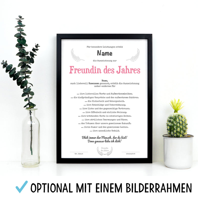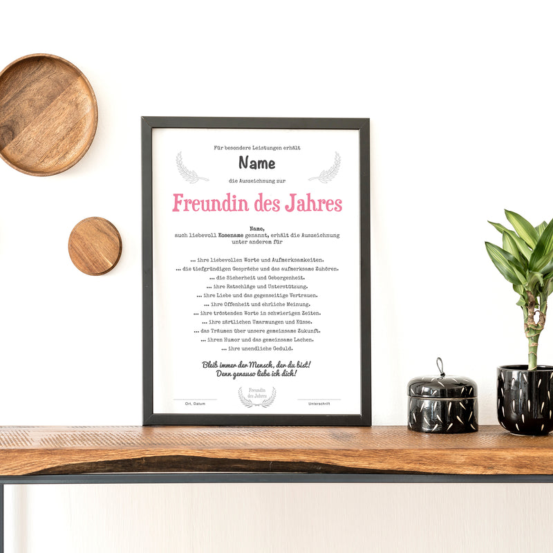 Freundin des Jahres Bild optional im Holz-Rahmen Personalisiert mit Namen Geschenke Geschenkideen für Frauen zum Geburtstag Weihnachten
