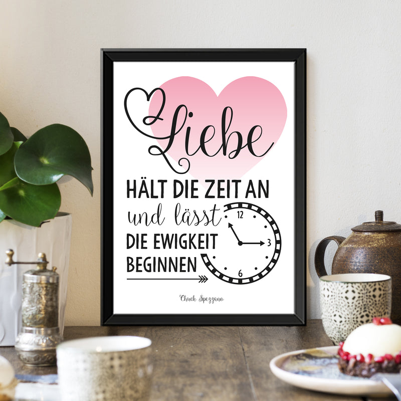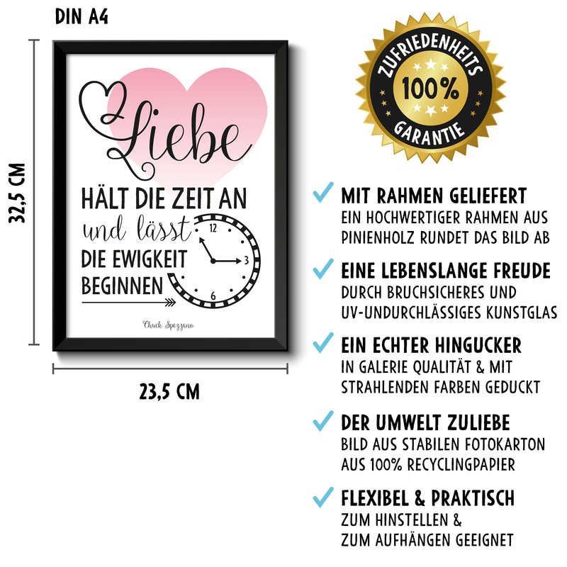 Liebe hält die Zeit an Bild im Holz-Rahmen A4 Geschenke Geschenkideen für Freund Freundin Mann und Frau zum Geburtstag Weihnachten