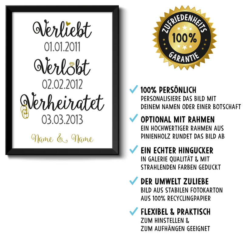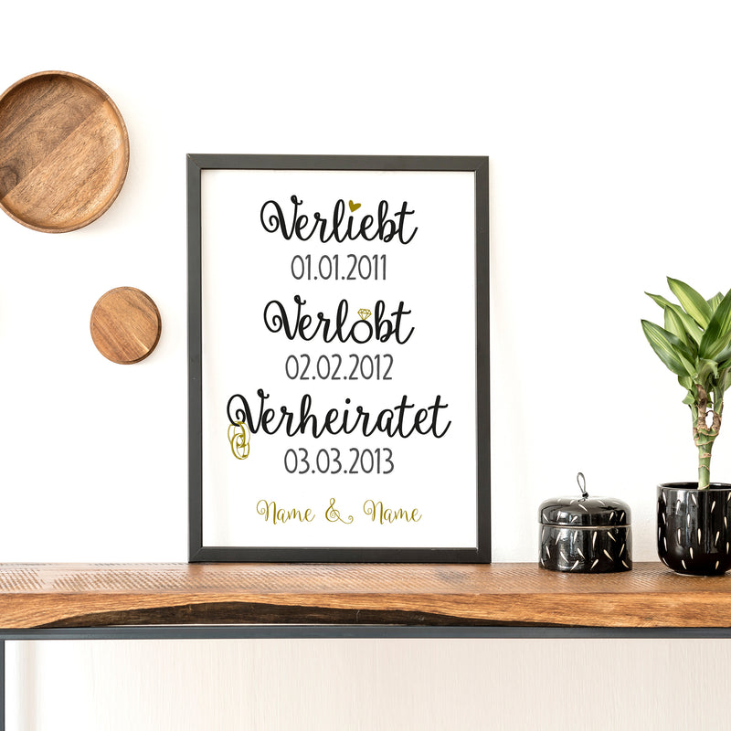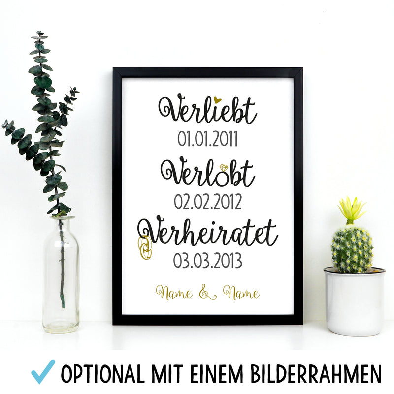 Verliebt Verlobt Verheiratet Bild optional im Holz-Rahmen Personalisiert mit Namen Geschenke Geschenkideen für Freund Freundin Mann und Frau zum Geburtstag Weihnachten