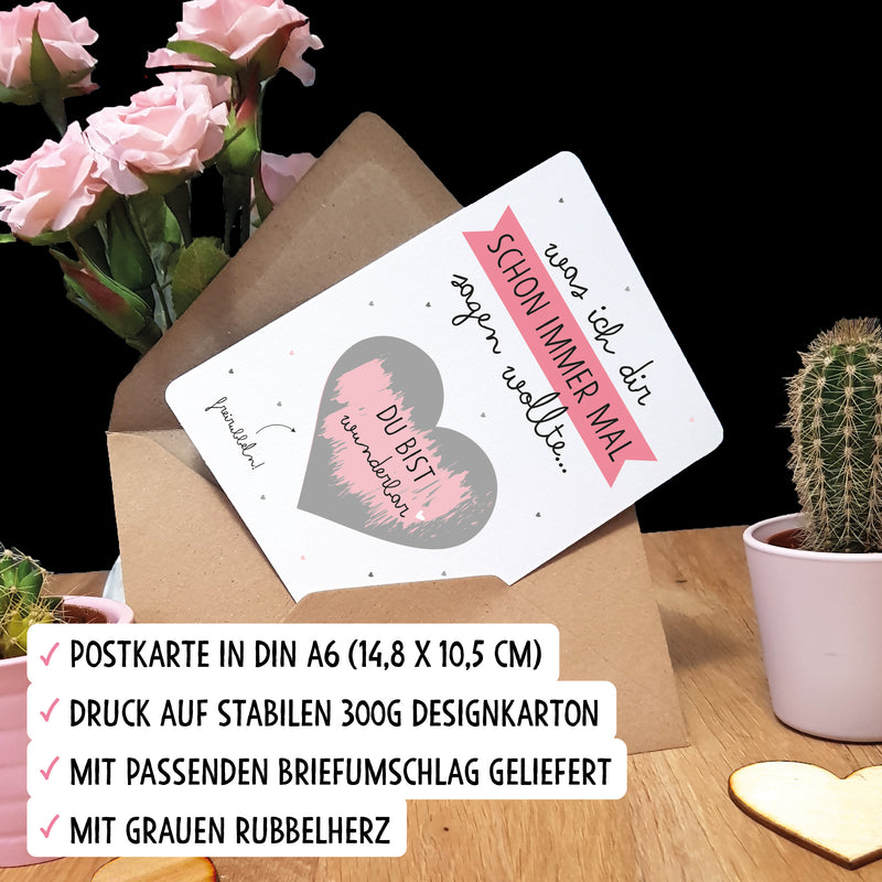 TOP QUALITÄT: Die Rubbelkarte in DIN A6 ist extra dick, hochwertig bedruckt und wird mit einem Kraftkarton Briefumschlag geliefert. Die Ecken sind für eine schönere Optik und Haptik abgerundet. Das Rubbelherz ist in Silber und lässt sich ganz einfach mit einem Geldstück freirubbeln.